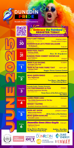 Dunedin Pride is a week-long celebration of love, identity, and community happening May 30–June 6. With a full lineup of inclusive events—from family-friendly gatherings and art shows to nightlife and live performances—Dunedin Pride brings people together to uplift and honor the LGBTQ+ community. Powered by the Dunedin Chamber of Commerce and the City of Dunedin, this celebration is a reflection of our town’s heart: welcoming, diverse, and full of pride.